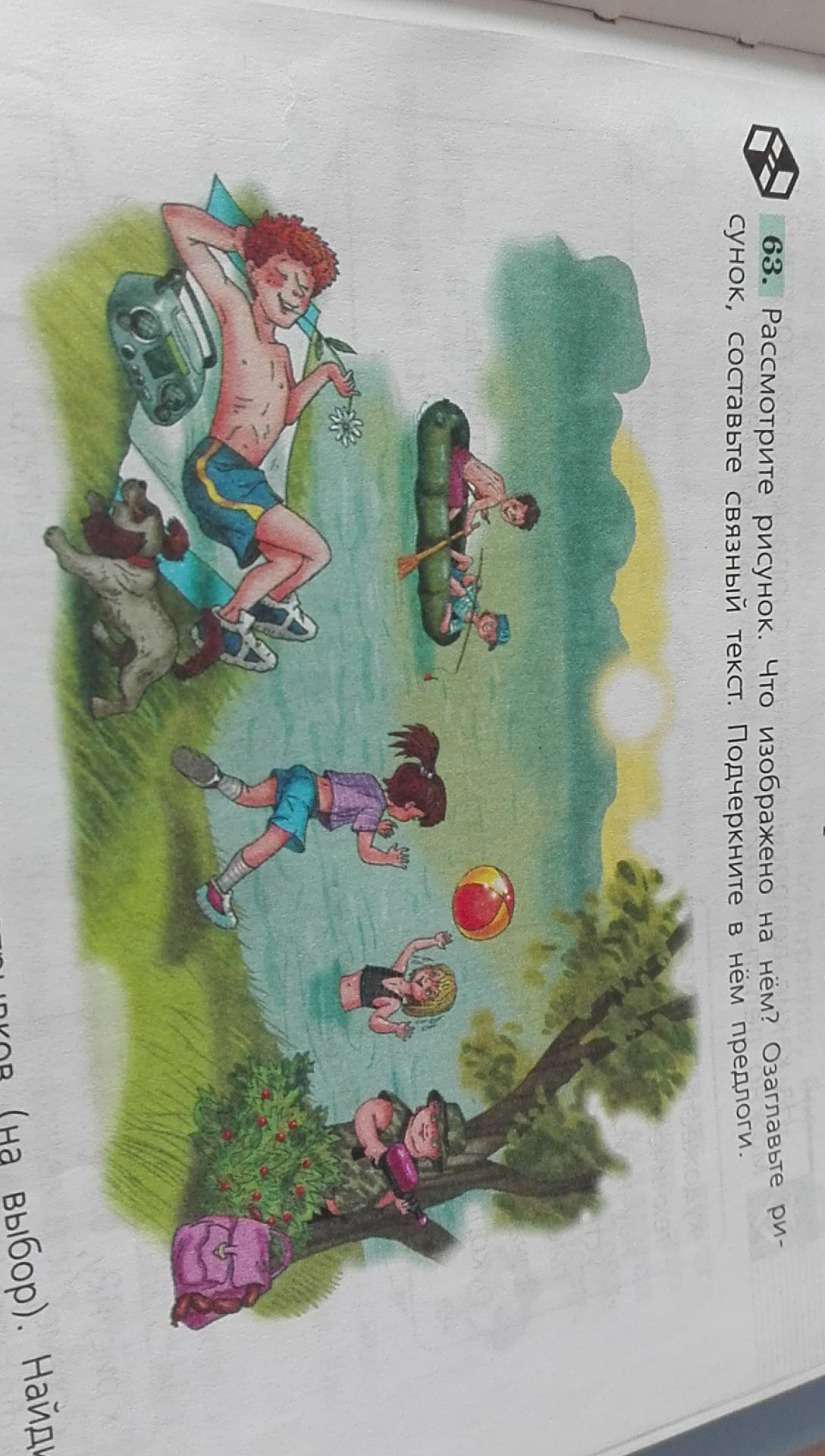 катание на лодке,игра в мяч или просто спокойный отдых,лёжа на траве. На рисунке мы также можем увидеть собачку,которая,вероятно,с радостным лаем бегает по берегу.