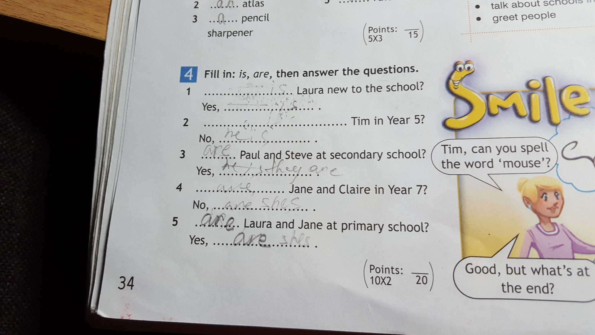 1. Is, she is. 2. Is, he isn't. 3. Are, they are. 4. Are, they aren't. 5. Are, they are.