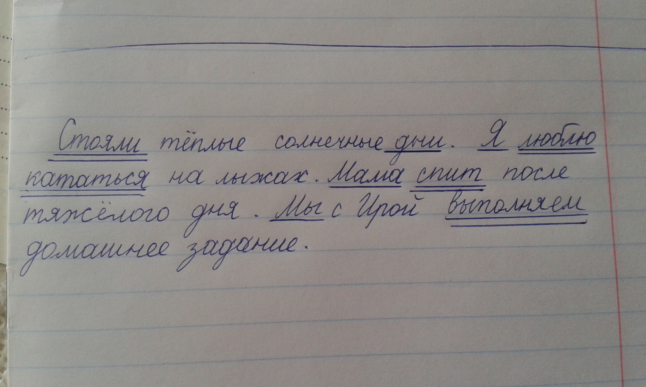 Прочитай предложения.Подчеркни в каждом предложении грамматическую основу. Стояли тёплые солнечные дни. Я люблю кататься на лыжах. Мама спит после тяжелого рабочего дня. Мы с Ирой выполняем домашнее задание