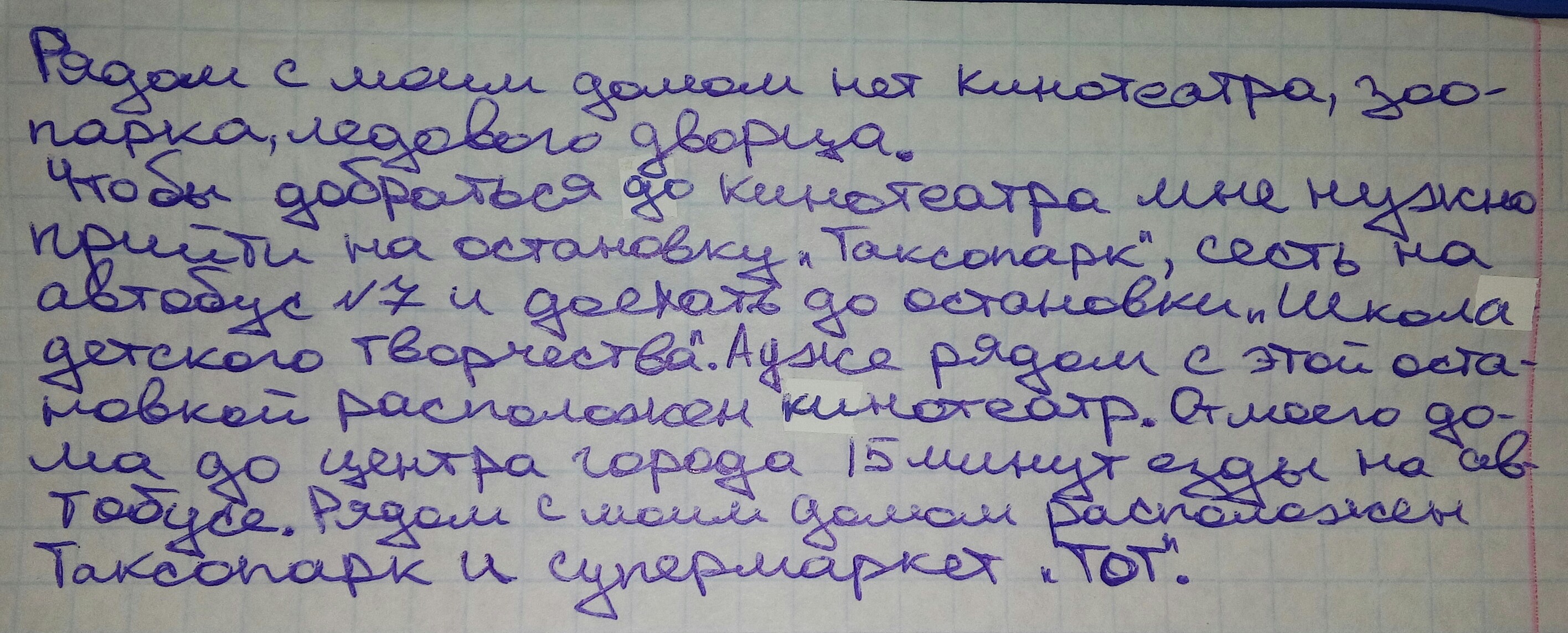 менин уйимнин жанында кинотеатр зообак жане музды сарай жок.Маган кинотеатрга жету ушинаялдамага бару керек аялдамадан номери 7 автобуска минуим керек сосын школа детского твочества содан сон аялдаманын касында кинотеатр орналаскан менин уймнен кинотеатрга дейин 15 минут кетеды менин уйимнин касында таксопарк пен супермаркет бар ТОТ
