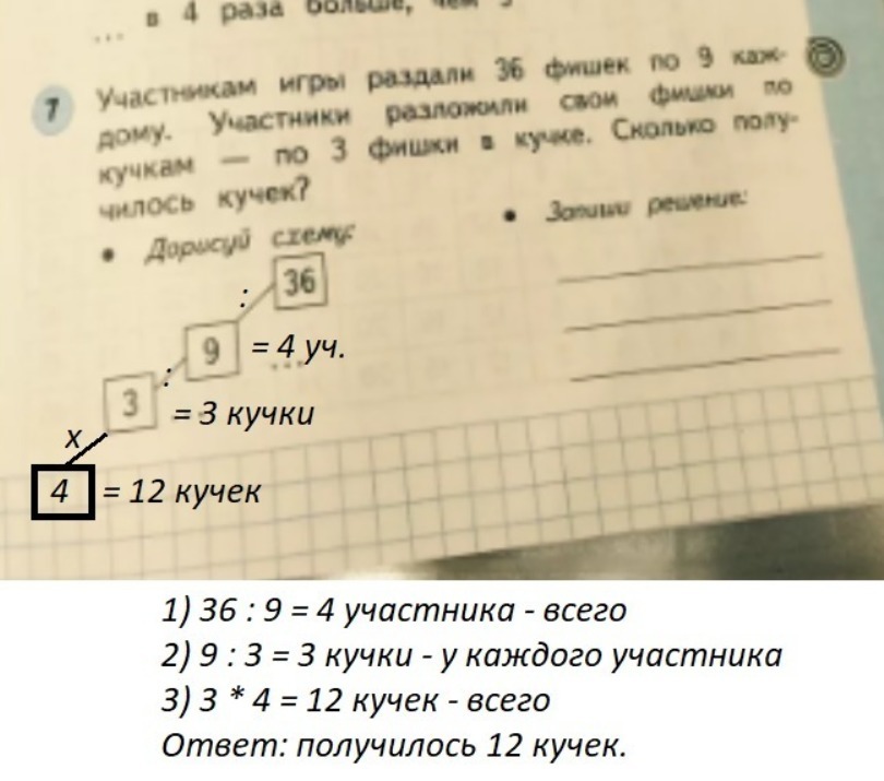 2) Участникам игры раздали 36 фишек по 9 каждому. Участники разложили свои фишки по кучкам - по 3 фишки в кучке. Сколько получилось кучек? Запиши решение!!!!