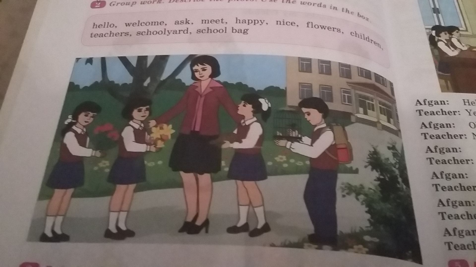 Если нужен перевод: hello- здравствуйте , meet - приветствие , happy -счастливый , nice - прелестный , flowers - цветы , teachers - учителя , schoolyard - школьный двор , school bag - школьный портфель.