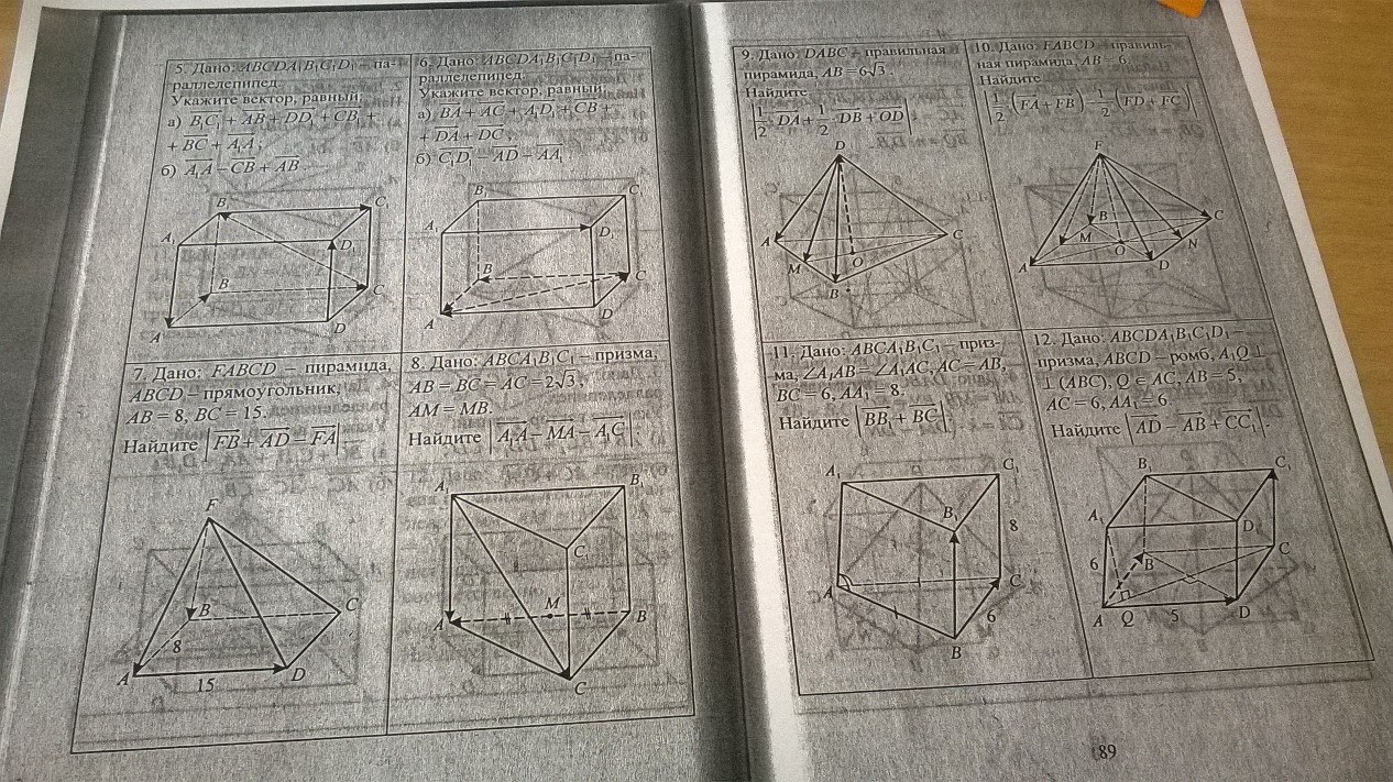 7) FB+AD=FB+BC=FC, FC-FA=AC -диагональ основания (направление вектора не имеет значения, так как это длина) 225+64= 289, АС=17