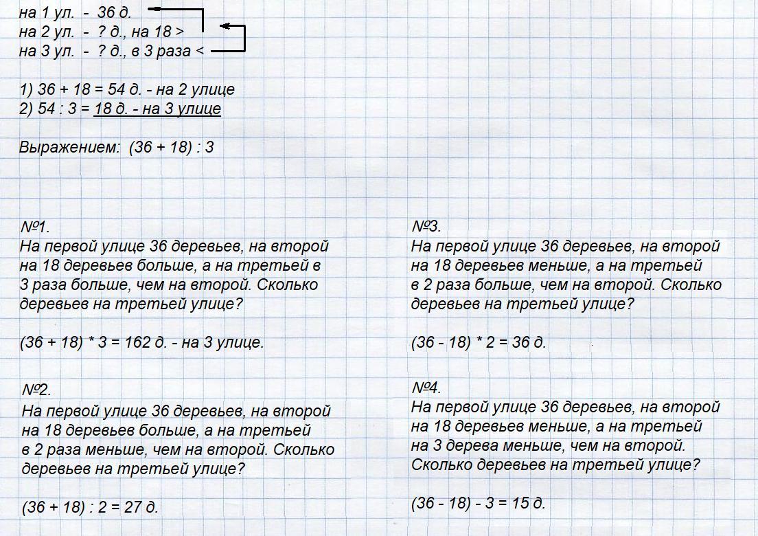 ( Измени условие задачи так, чтобы её решением было выражение: 1) (36+18) * 3, 2) (36+18) :2, 3) (36-18) * 2, 4) (36-18)-3.