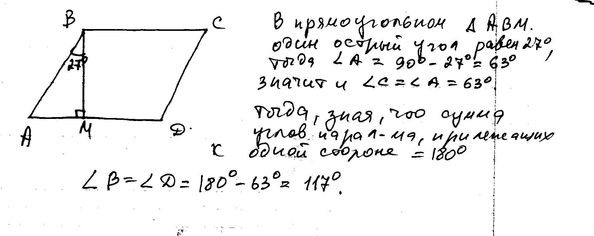 Высота параллелограмма составляет со стороной угол 27 градусов. НАЙДИТЕ УГЛЫ ПАРАЛЛЕЛОГРАММА. Спасибо.