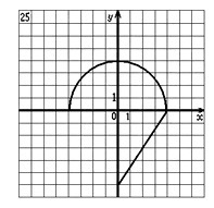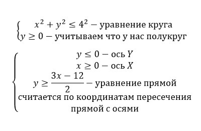Первая область располагается, начиная от горизонтальной оси Х и ограничена полуокружностью, т.е. представляет собой полукруг. Радиус окружности равен 4, следовательно её уравнение записывается в виде x²+y²=4², а условие принадлежности точки полукругу выглядит как x²+y²≤16 ∩ x≥0, где ∩ - знак объединения множества точек.