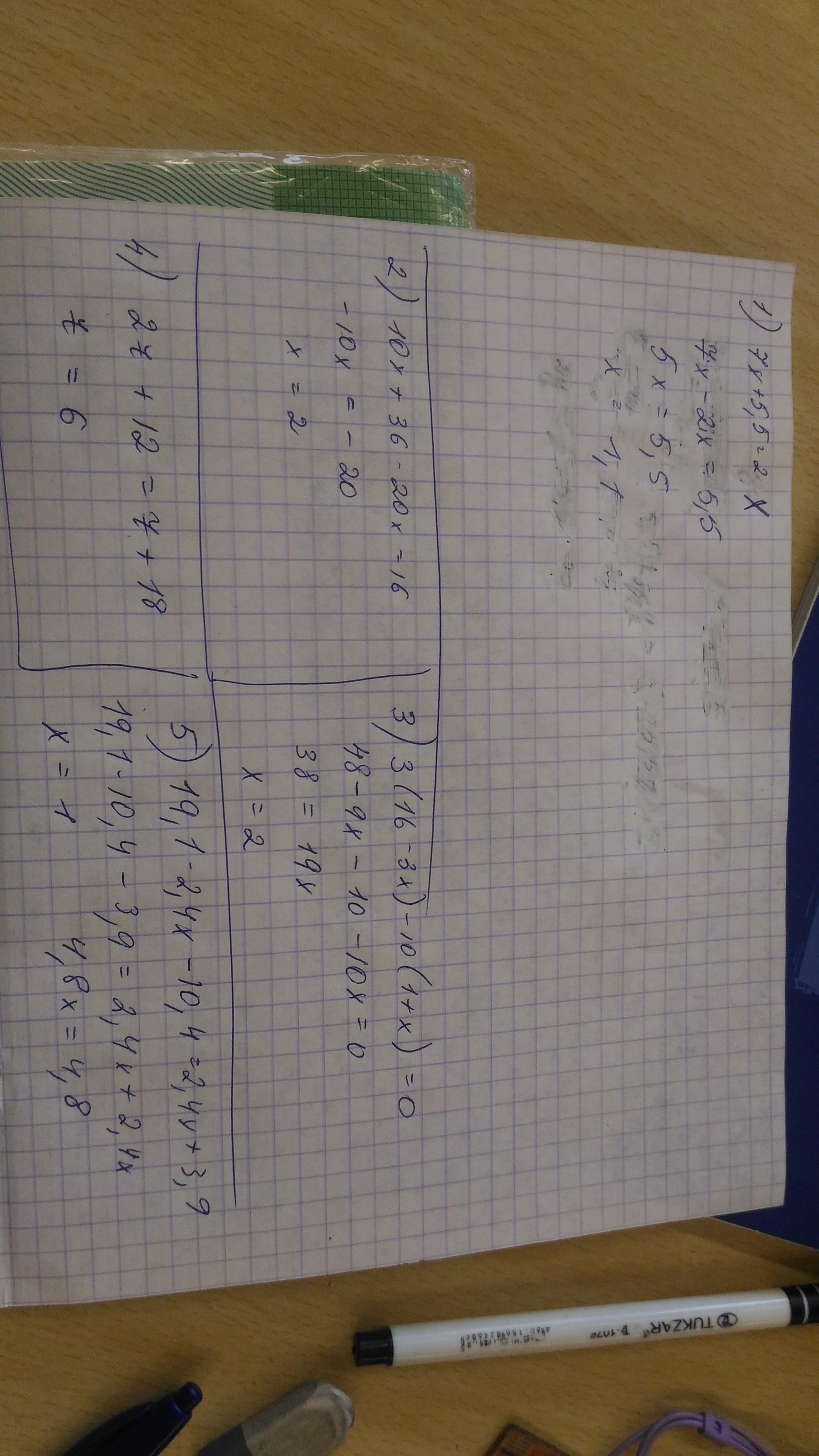 помогите решить уравнения : 7х +5,5 =2y; 10х +36 - 20х=16; 3 (16 - 3х) - 10 (1+х)=0; 2z + 12 = z +18; 19, 1 - 2,4 х - 10,4= 2,4х + 3,9.