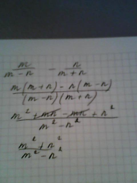 m / ( m - n ) - n / ( m + n ) = ( m( m + n ) - n( m - n )) / ( m^2 - n^2 ) = ( m^2 + mn - mn + n^2 ) / ( m^2 - n^2 ) = ( m^2 + n^2 ) / ( m^2 - n^2 )