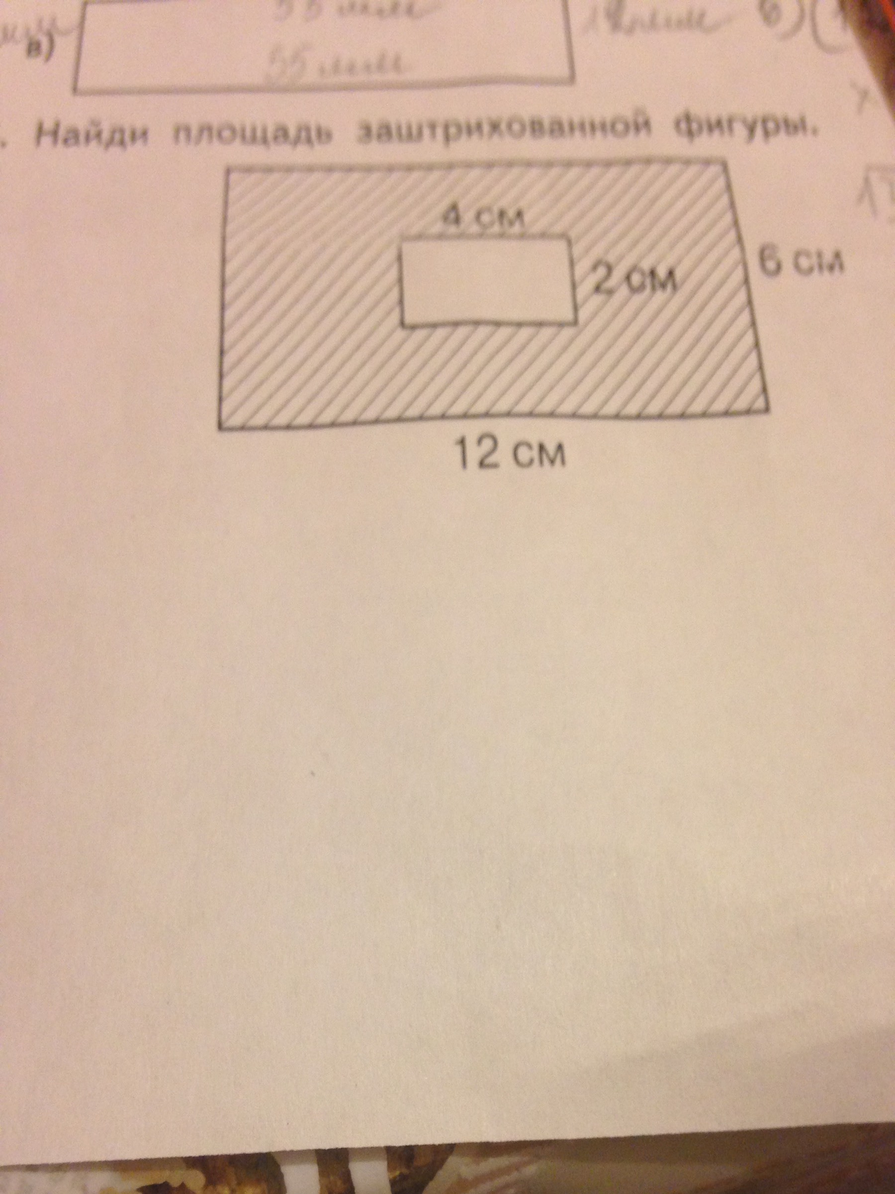 Это очень просто, смотри, сначала находим площадь мелкой фигуры, она равна 4*2 = 8 см2. Теперь находим площадь большой, она равна - 12 * 6 = 72 см2. А теперь просто отнимаем 72 см2 - 8 см2 = 64 см2. Вот эти 64 см2 и есть площадь заштрихованой фигуры.