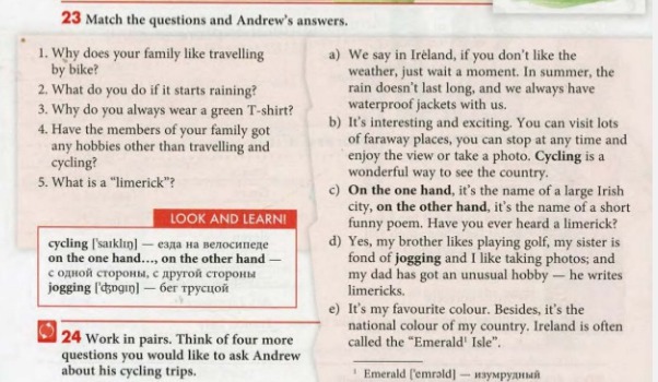 Match the questions and Andrew's answers. ПОМОГИТЕ НА КАРТИНКЕ НАПИСАНЫ ВОПРОСЫ!! №23