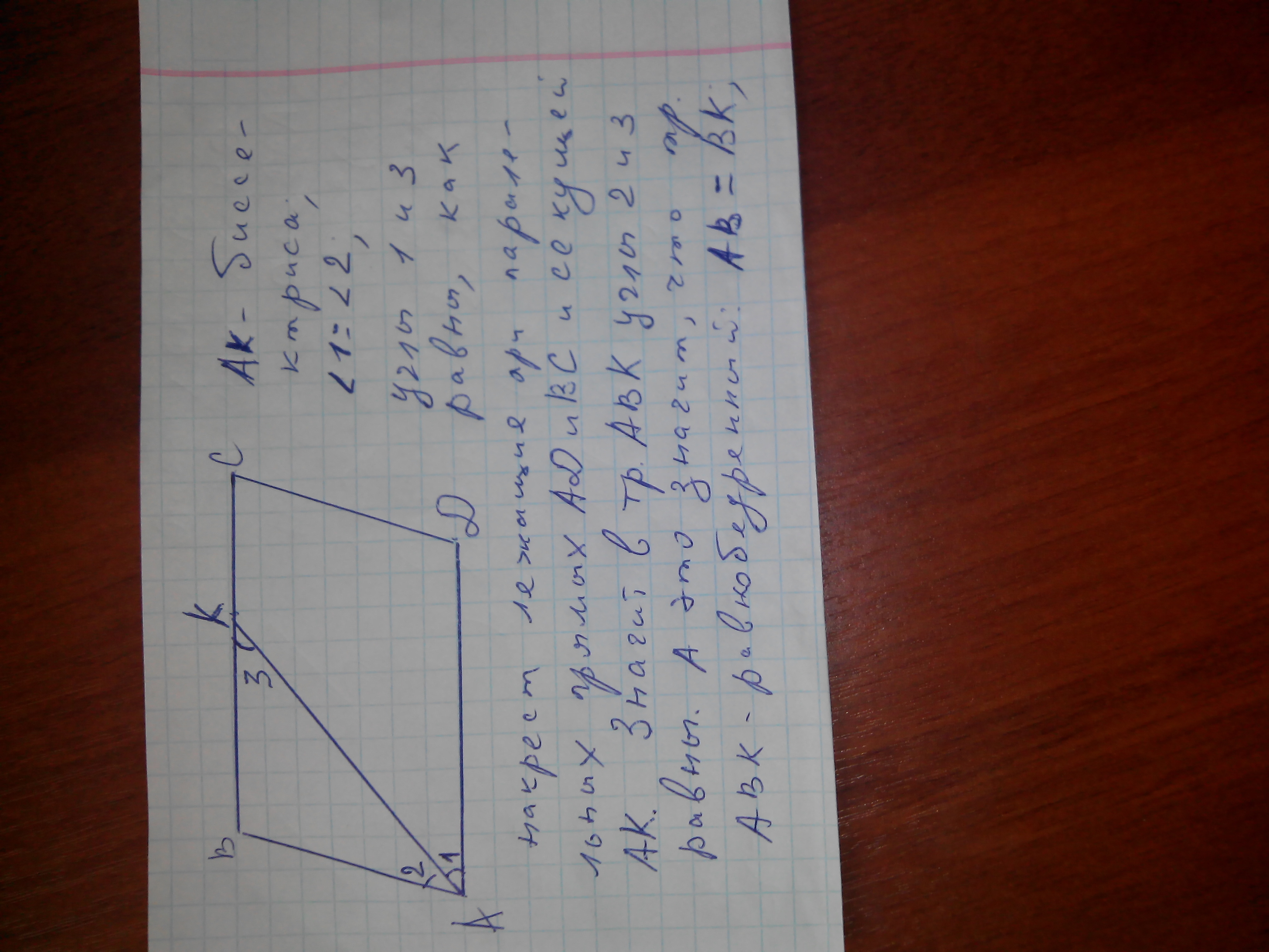 Биссектриса угла параллелограмма отсекает от него равнобедренный треугольник.Доказать утверждение пожалуйста)