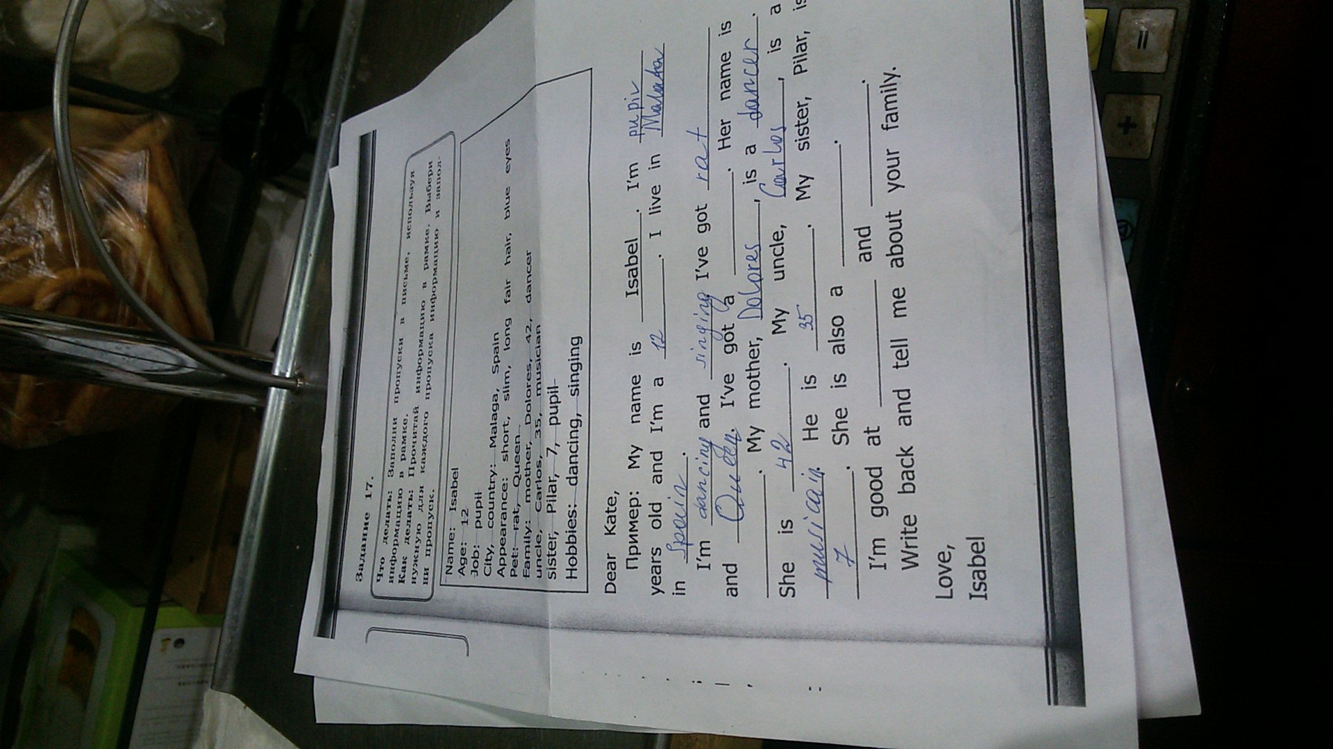 Написаны правильные варианты вставленных слов. 12, pupil, Malaga(+), Spain(+), long, slim, mother, uncle, rat, Queen, Dolores(+), dancer(+), 42(+), Carlos(+), musician(+), 35(+), 7(+), pupil, dancing, singing