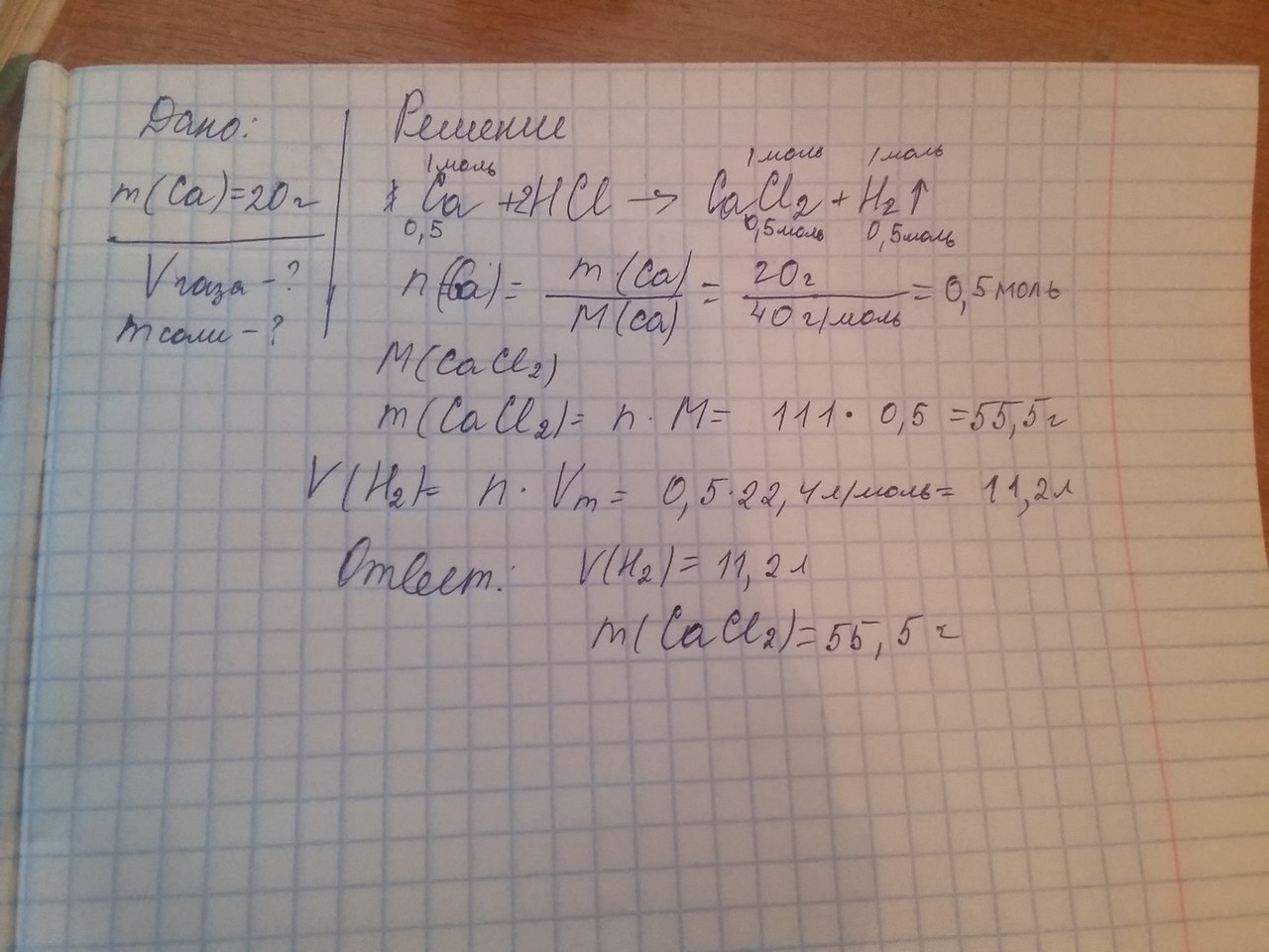 При взаимодействии 20 г кальция и соляной кислоты выделяется газ. Определите его объем( при н.у.) и массу полученной соли. СРОЧНО!!!