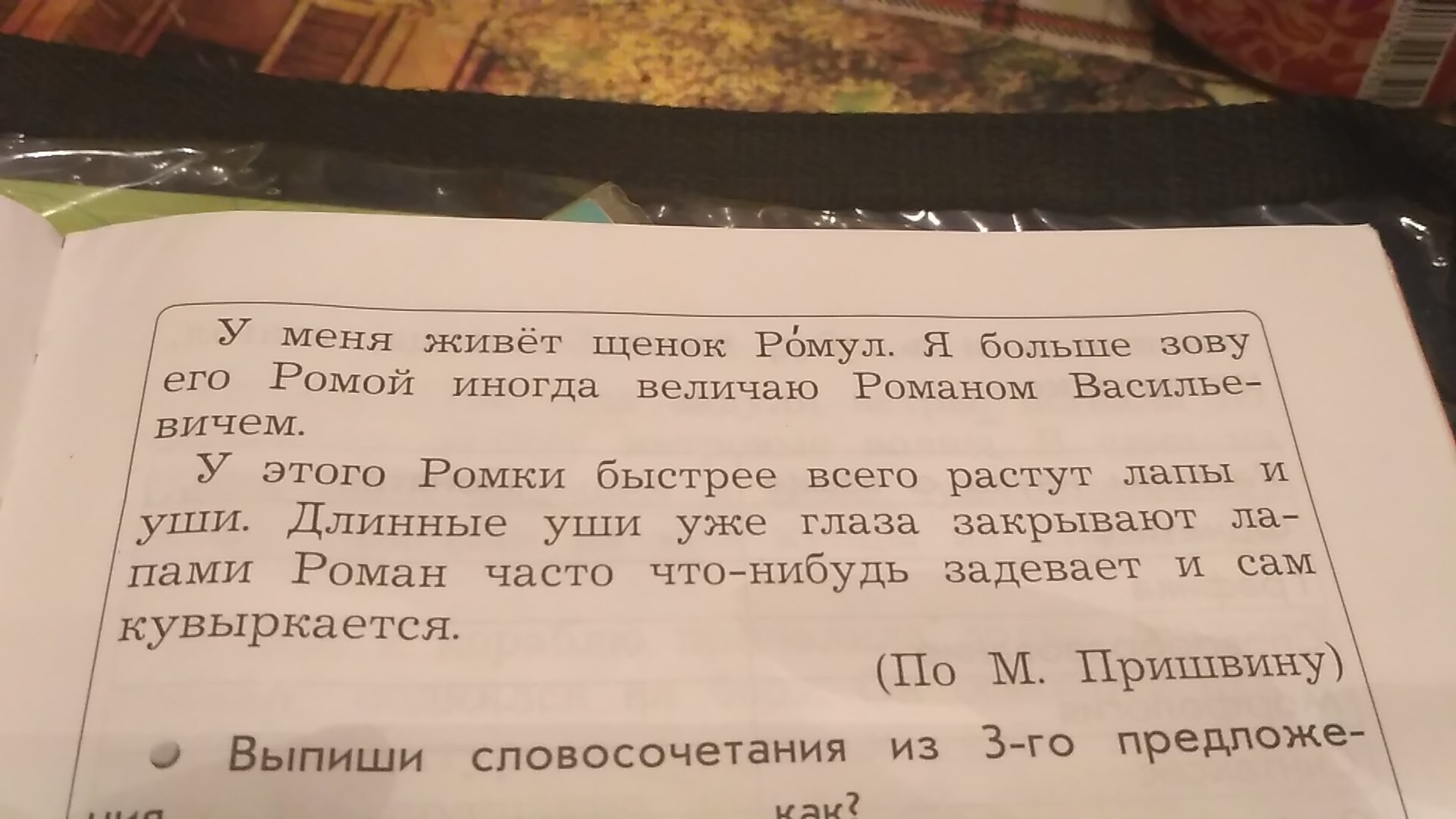 Живет-сказуемое, щенок Ромул-подлежащее. Я - подлежащее, зову, величаю-сказуемое. Растут-сказуемое, лапы, уши, подлежащее. Уши-подлежащее, закрывают-сказуемое. Роман-подлежащее, задевает, кувыркается-сказуемое.