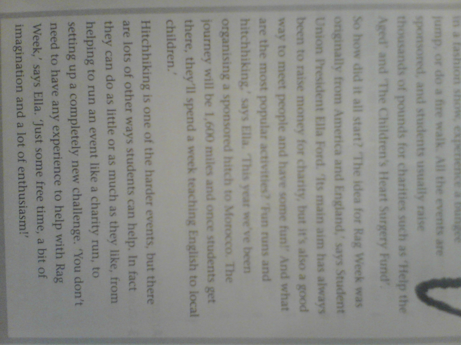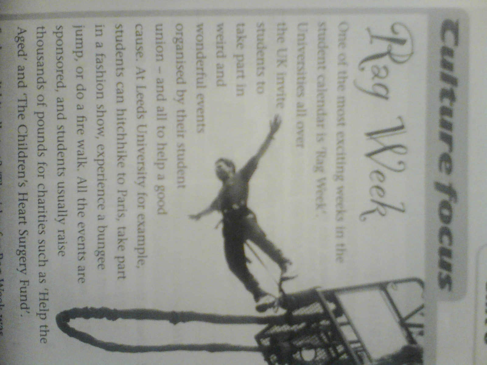 Одна из самых захватывающих недель в календаре студент Rag неделя miversities всей Великобритании приглашают принять участие в странных и удивительных событиях, организованных их студенческий союз и все, чтобы помочь благому делу. В Лидском университете, например, студенты могут автостопом в Париж, принять участие в показе мод, испытать прыжок на тарзанке, или сделать пожарную прогулку. Все события, спонсируются, и студенты, как правило, поднимают тысячи фунтов для благотворительных организаций, таких как "Помощь престарелым и Детский фонд операции на сердце».