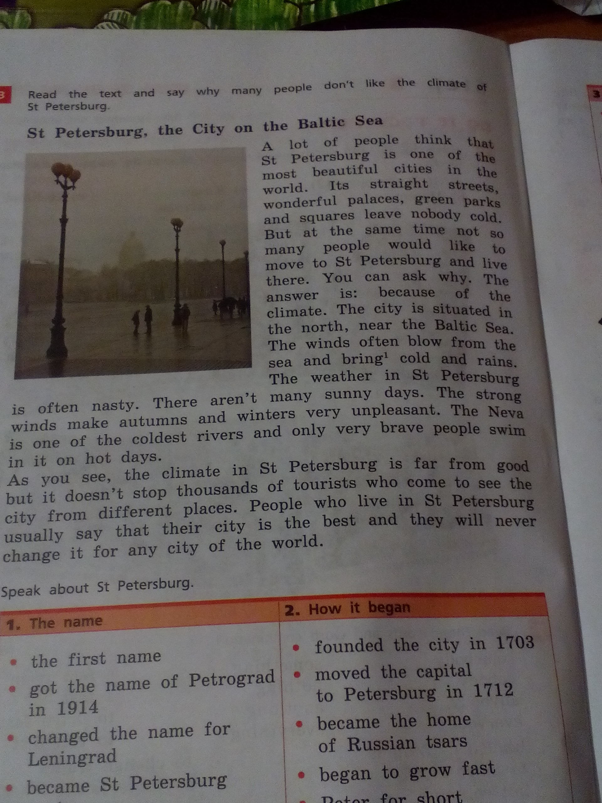 Многие люди считают, что Санкт Петербург один из самых красивых городов во всем мире.У него есть него прямые улицы, прекрасные места, зеленые папки и площади, которые никого не оставляют бесстрастными. Но в такие времена не так много людей хотят переехать в Санкт Петербурге и жить там. Ты можешь спросить, почему? Ответ такой: из-за климата. Город расположен на севере недалеко от Балтийского моря. Ветра часто дуют с моря и приносят холод и дожди. Погода в Санкт Петербурге отвратительная. Не так много солнечных дней. Сильные ветры делают очень и ветра очень неприятны. Нива одна из самых холодных рек и только самые смелые люди купаются в ней в теплые дни. Как видишь, климат в Санкт Петербурге далек от идеала, но это не останавливает тысячи туристов, которые приезжают посмотреть город, из других мест. Люди, которые живут в Санкт Петербурге, часто говорят, что из город лучший во всем мире, и они никогда его не поменяют на другой.