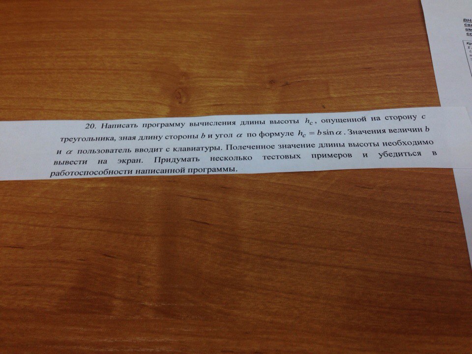 Написать программу вычисления длины высоты h c, опущенной на сторону с треугольник , зная длину стороны b и угол a по формуле hc=bsina, значения величин b и a пользователь вводит с клавиатуры.Полученное значение длины высоты необходимо вывести на экран . Придумать несколько тестовых примеров и убедиться в работоспособности написанной программы