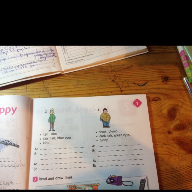 B: She's tall and slim. She's got fair hair and blue eyes.
