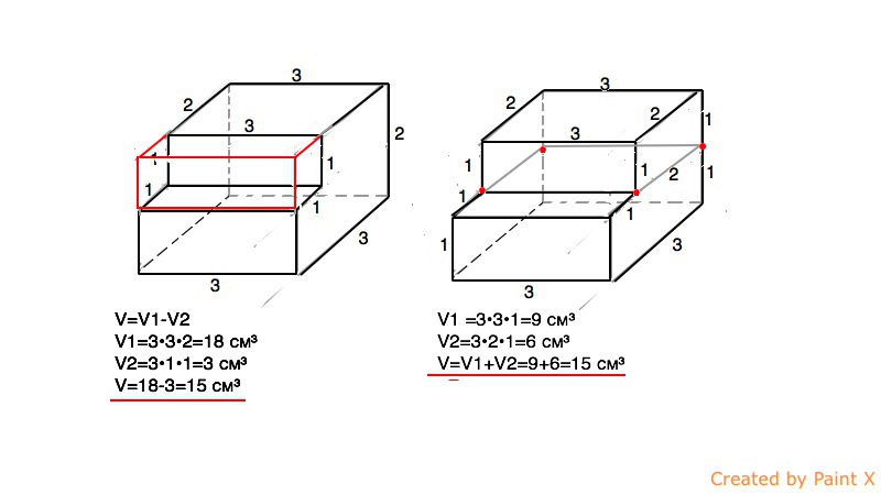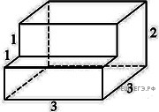 Тогда объем V данного многогранника будет равен объему V1 достроенного параллелепипеда без «пристройки», т.е. без объема V2 параллелепипеда с измерениями 3 см,1 см,1 см.