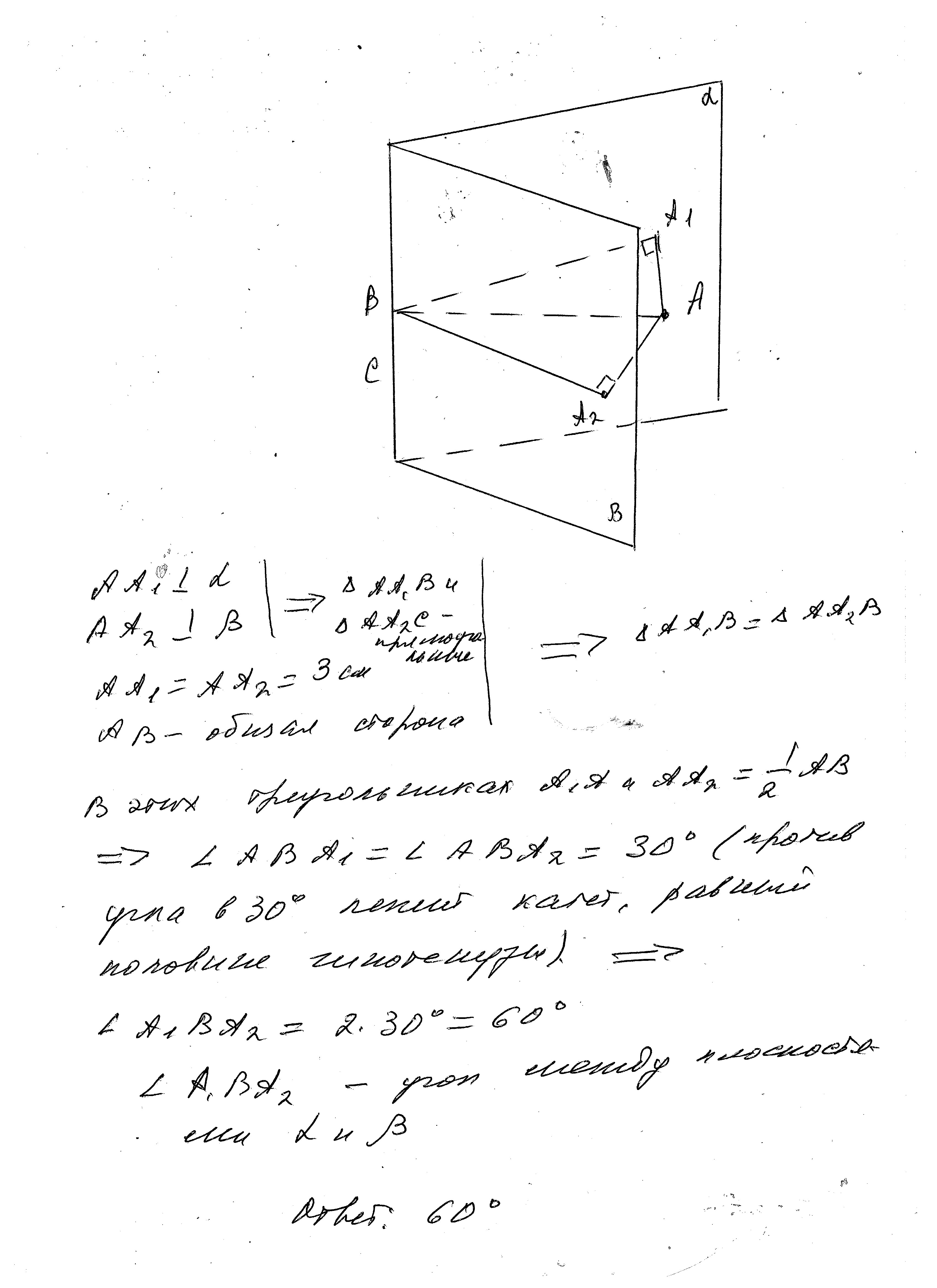 плоскости альфа и бета пересекаются по прямой с.Найти угол между альфа и бета,если точка удалена от каждой плоскости на 3 см,удалена от прямой на 6 см.