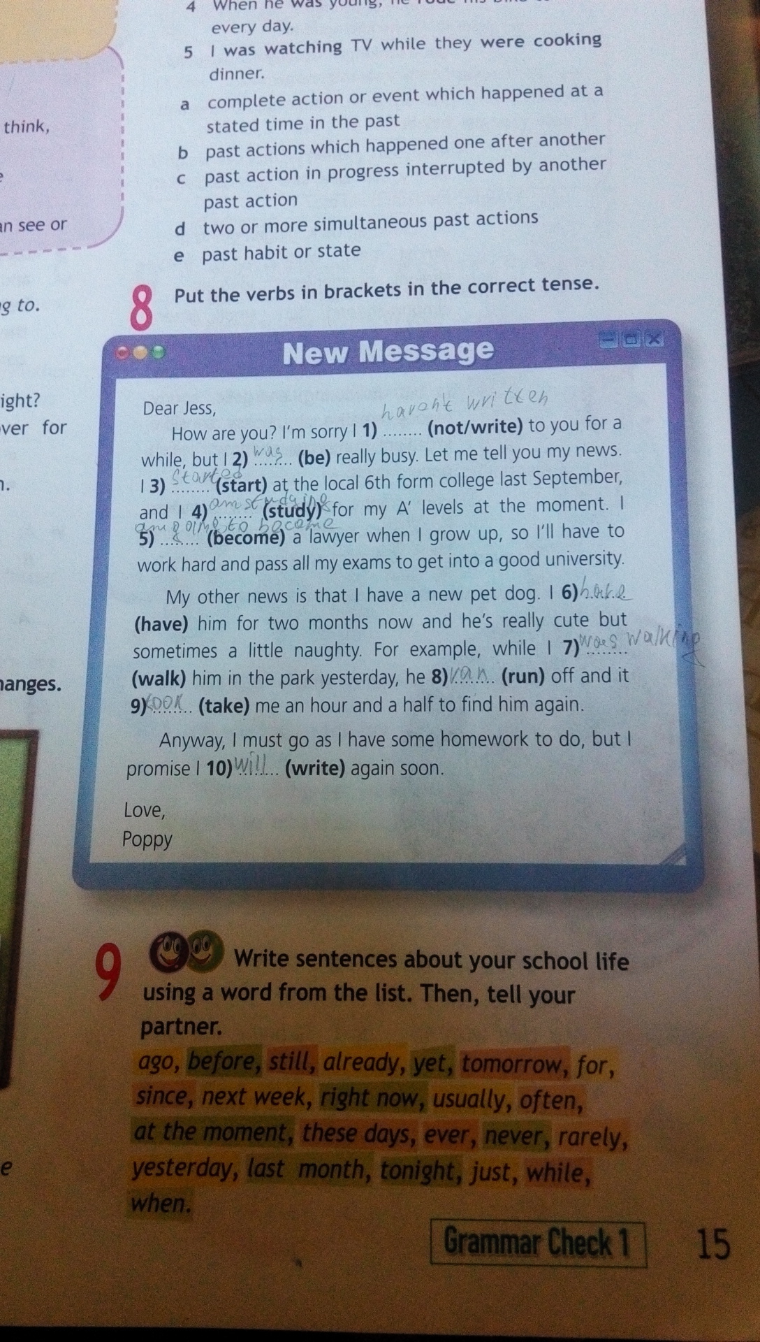 Дорогая Джесс,Как дела? Я сожалею, что не писал вам некоторое время, но я был очень занят. Позвольте мне рассказать вам о моих новостях. Я начал 6-й класс колледжа в сентябре прошлого года, и я учусь на "пятёрки" в данный момент. Я собираюсь стать адвокатом, когда вырасту, так что мне придется много работать и сдать все экзамены, чтобы попасть в хороший университет.Моя другая новость заключается в том, что у меня есть новый пёс. Он у меня уже два месяца, и он очень милый, но иногда немного озорной. Например, в то время как я шел с ним в парке вчера, он убежал, и у меня ушел час-полтора, чтобы найти его снова.Так или иначе, я должен идти, мне есть над чем поработать, но я обещаю, что напишу позже.С любовью, Мак