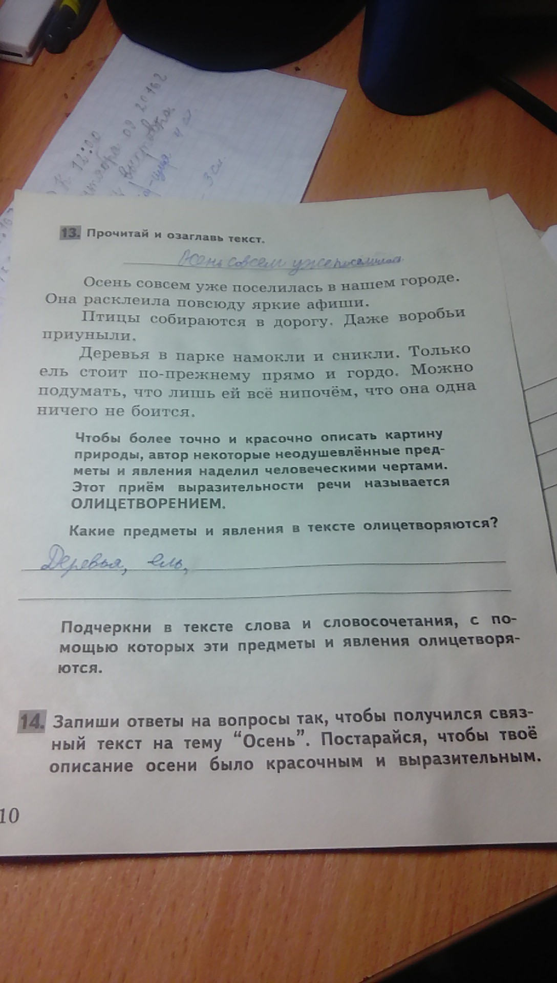 В тексте: осень поселилась, она же и расклеила. Воробьи приуныли. Деревья намокли и сникли. Ель стоит.