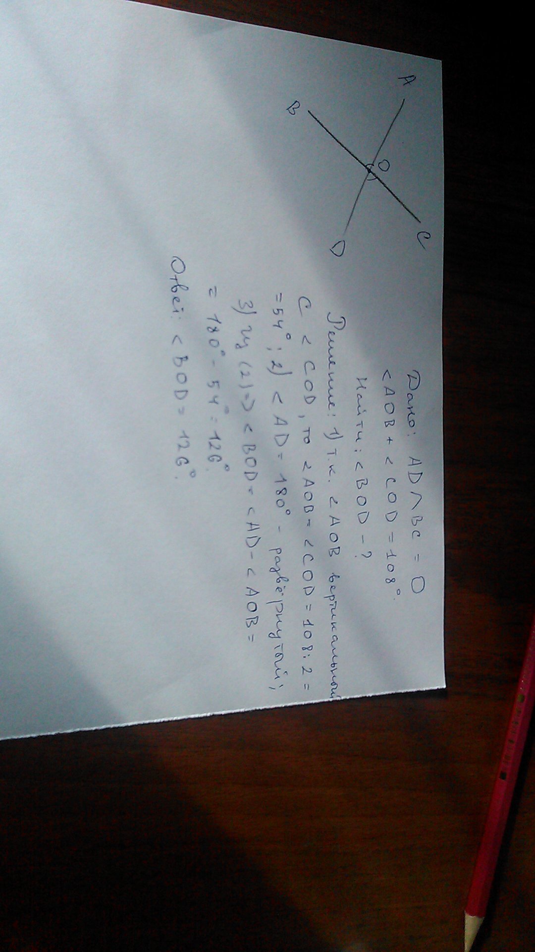 Здравстуйте помогите решить. Сумма вертикальных углов АОВ и СОД, образованных при пересечении прямых АД и ВС, рана 108°. Найдите угол ВОД.