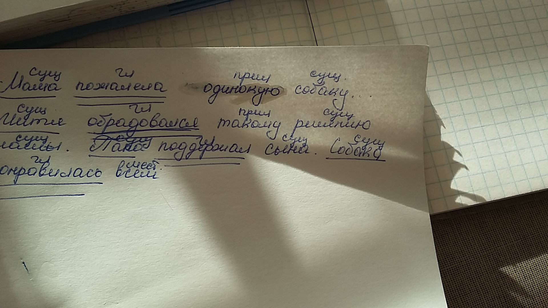Мама кто? подлежащее имя существительное одной чёрточкой подчёркивать пожалела сказуемое что сделала? 2 чёрточками глагол.Митя кто? подлежащие имя существительное обрадовался что сделал? глагол сказуемое. Папа кто? имя существительное, подлежащее. Поддержал что сделал? глагол, сказуемое.Собака кто? имя существительное подлежащее.Понравилась что сделала? глагол сказуемое