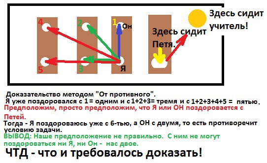 ЧИТАЕМ внимательно - "все кроме ПЕТИ" поздоровались с одним, тремя или пятью. ОДИН только Петя ни с кем просто не может поздороваться ни с кем. Ни двух, ни даже одного ученика в пару ему НЕТ.