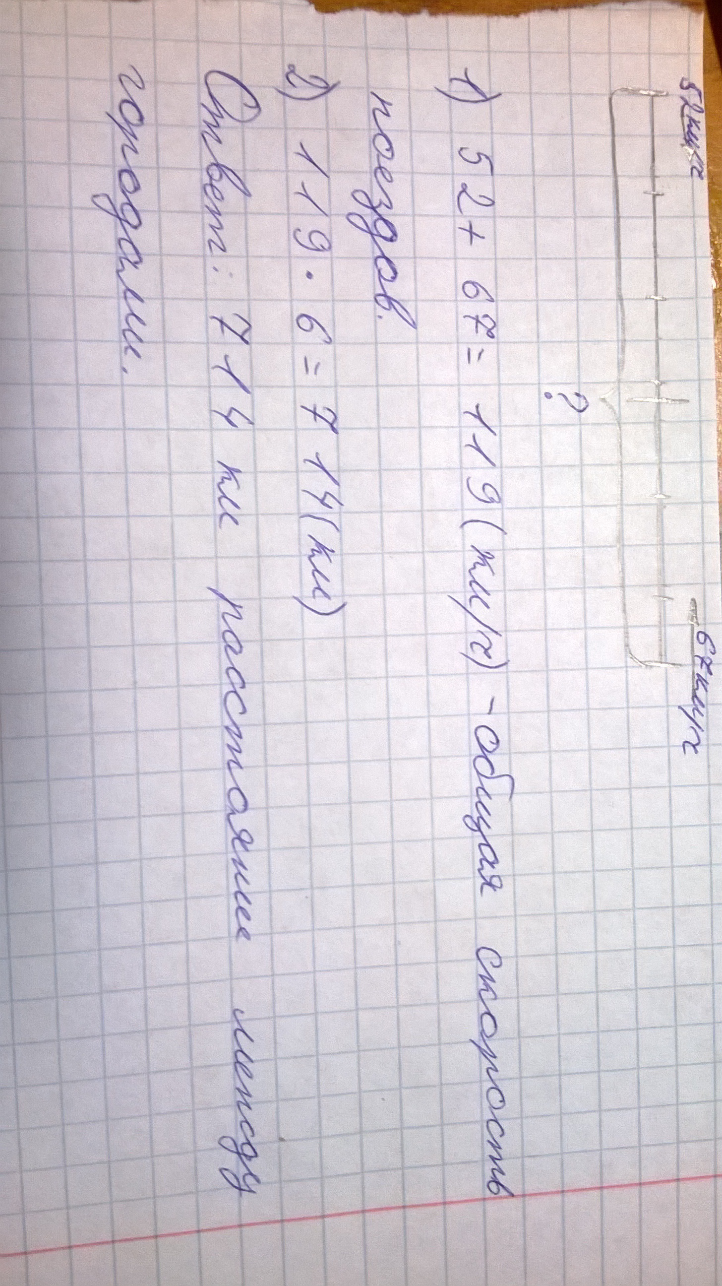 Прочитай задачу и сделай к ней чертеж Из двух городов навстречу друг другу одновременно вышли два поезда Один шел со скоростью 52 километров в час скорость другого было 67 километров в час через 6 часов Поезда встретились Найди расстояние между городами