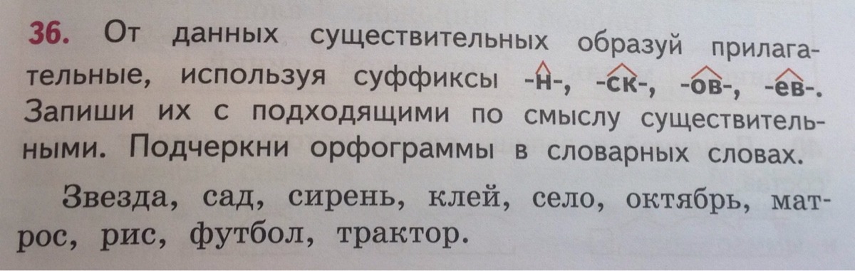 36. От данных существительных образуй прилагая тельные используя суффиксы Запиши их с подходящими по смыслу существительных юными Подчеркни программы в словарных словах Звезда сад сирень клей село октябрь мат рос рис футбол трактор