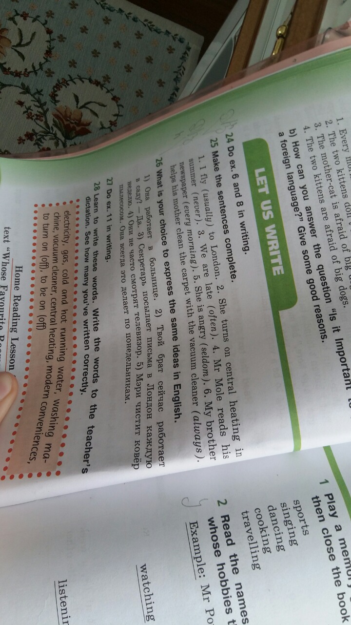 1. She works at a hospital. 2. Не уверена под "сад" имеется в виду "огород" или "детский сад", напишу оба варианта. Is your brother working in the garden now? Is your brother working in a kindergarten now? - yes, he is. 3. The secretary sends letters to London every week. 4. They don't often watch TV. 5. Mary is hoovering the rug (или the carpet). She always does it on Mondays.