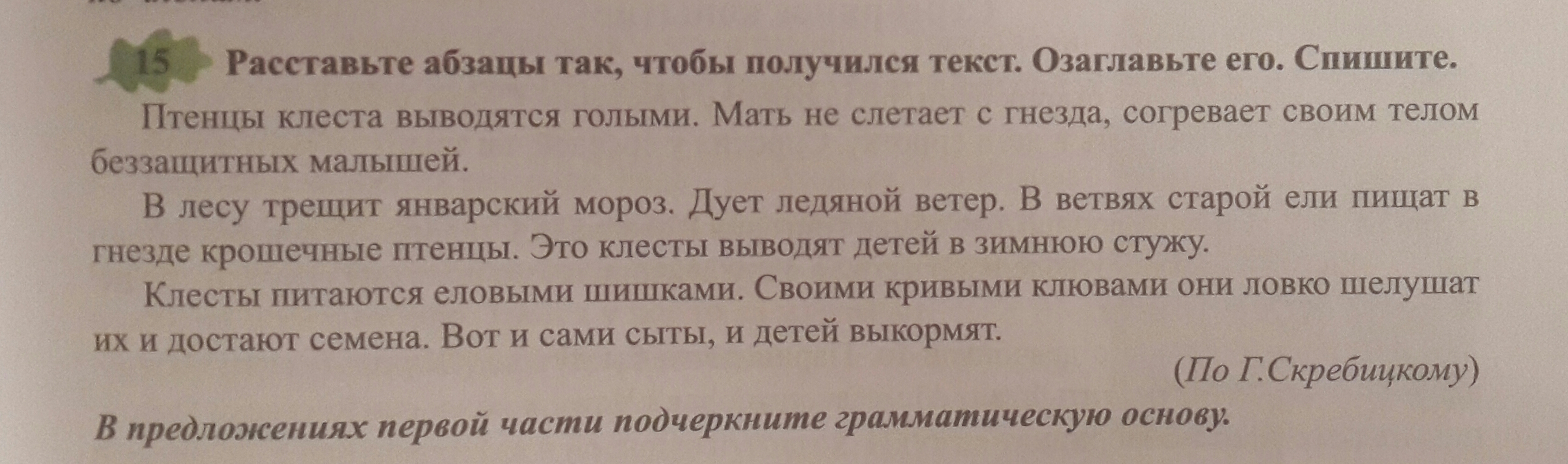 В лесу трещит январский мороз.Дует ледяной ветер в ветвях старой Ели пищат в гнезде крошечные птенцы. Мать не слитает с гнезда,согревает своим телом беззащитных малышей .