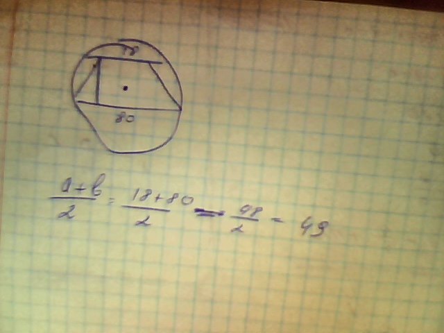 В окружность радиуса 41 вписана трапеция, основания которой равны 18 и 80, причем центр окружности лежит внутри трапеции. Найдите высоту этой трапеции.