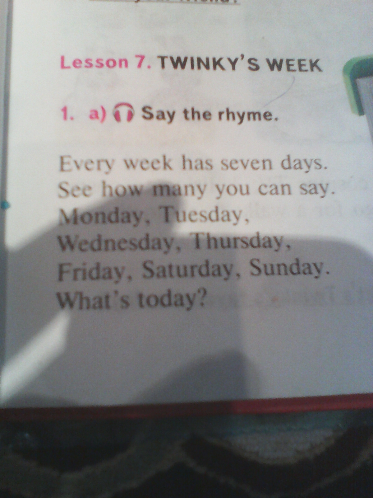(я немного исправила) эври виик хэс севен дэйс. Сии хав мэни ю кэн сэй. мандэй, тъюсдэй, вэднесдэй, зюрсдэй, фрайдэй, сатурдэй, сандей. ватс тудэй?