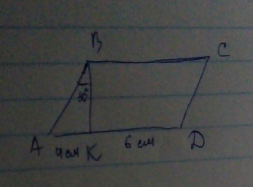 Высота BK параллелограмма ABCD делит его сторону AD на отрезки AK и KD такие, AK=4 см, KD=6 см. Найдите углы и периметр параллелограмма, если угол ABK= 30 ГРАДУСОВ