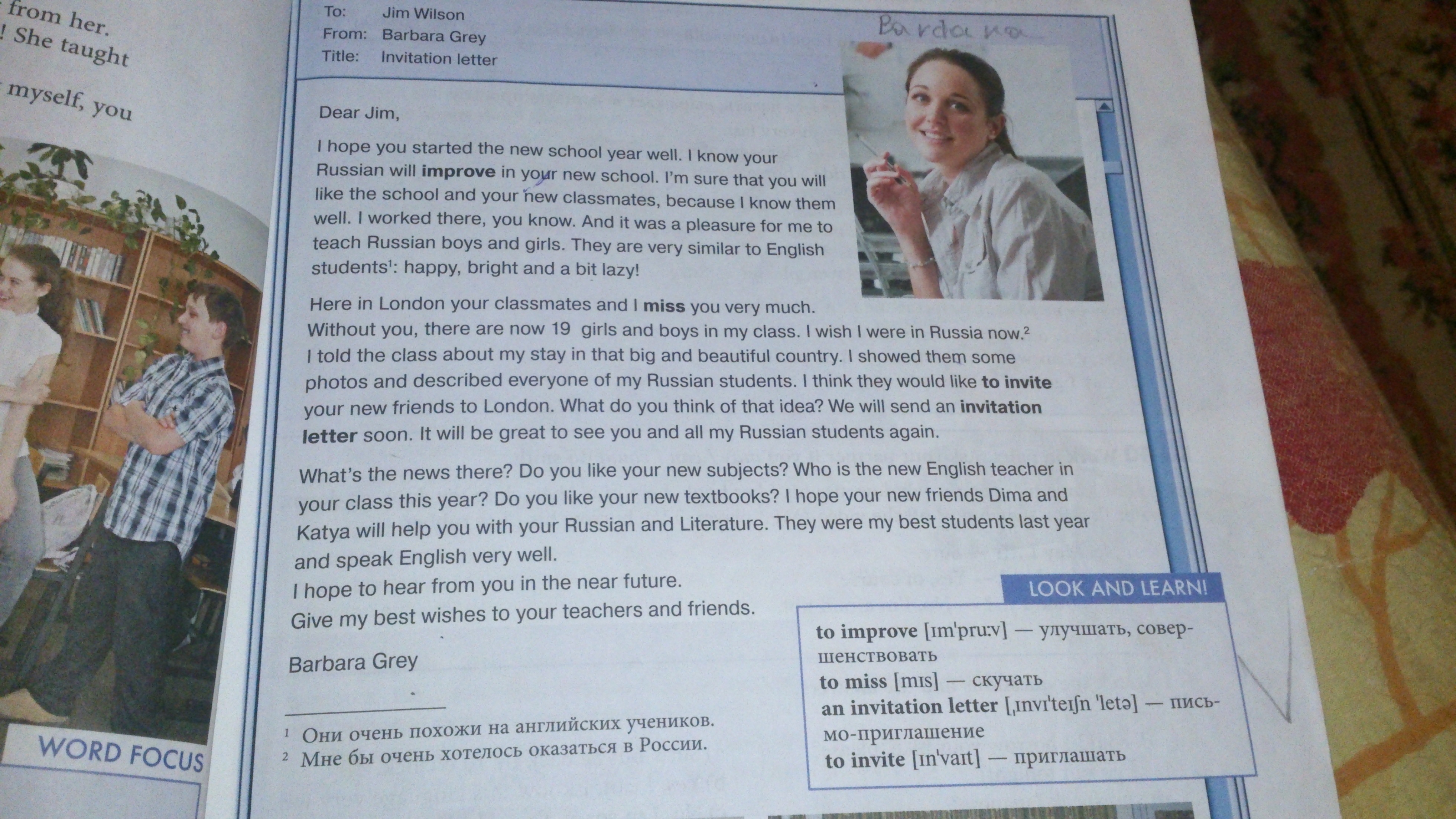 Я надеюсь ты хорошо начал свой новый учебный год. Я знаю что русский ты улучшишь в твоей новой школе. Я надеюсь тебе понравилась школа и твои одноклассники, потому что я знаю их хорошо. Я работала здесь, ты знаешь это. И это было удовольствие для меня учить русских девочек и мальчиков.Они очень похожи на английских студентов, счастливые, яркие, и немного ленивые.