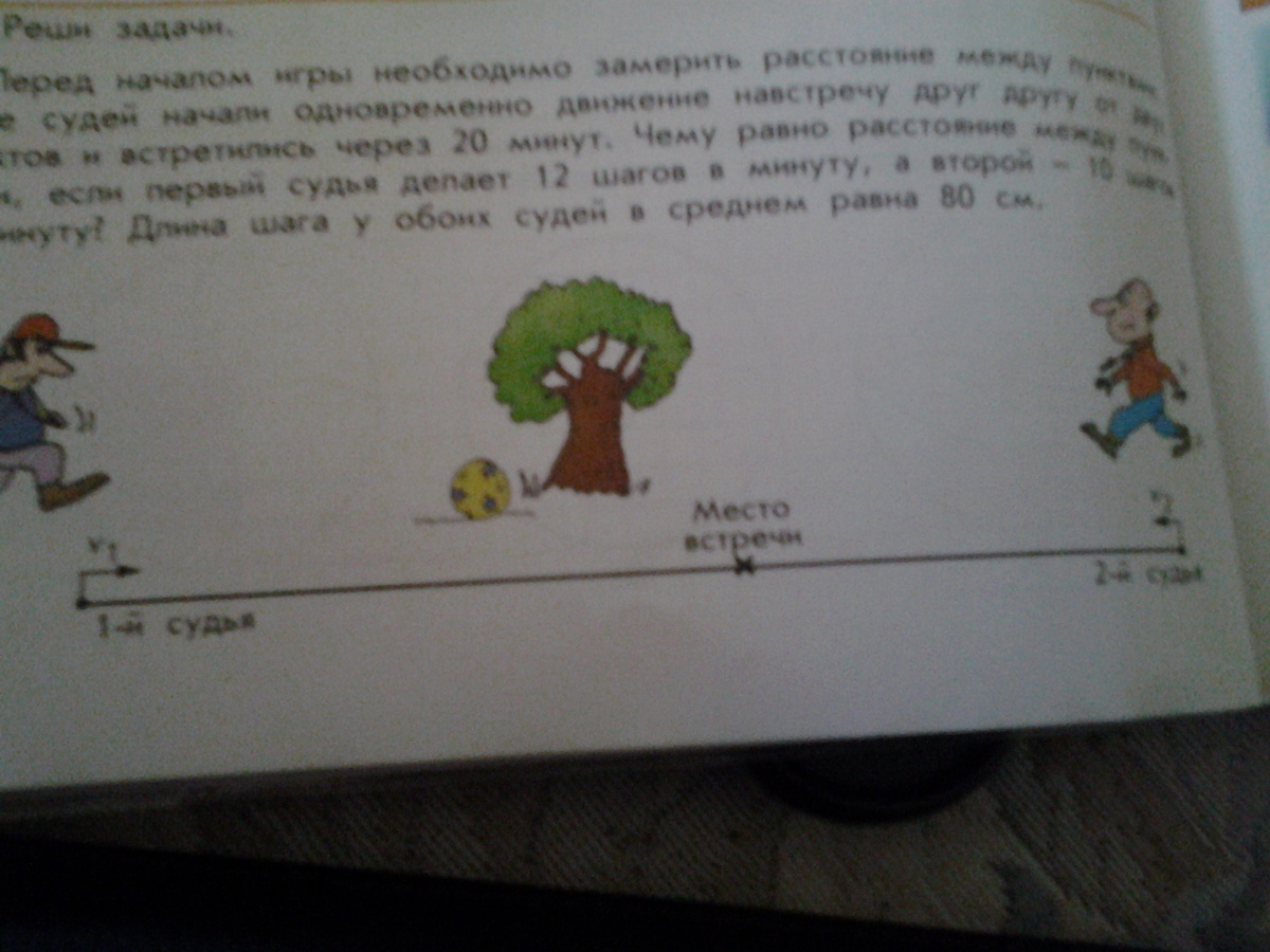 перед началом игры необходимо замерить расстояние между пунктами.Двое судей начали одновременно движение на встречу друг другу от двух пунктов и встретились через 20 минут.Чему равно расстояние между пунктами,если первый судья делает 12 шагов в минуту,а второй 10 шагов в минуту?Длина шага у обоих судей в среднем равна 80 см.