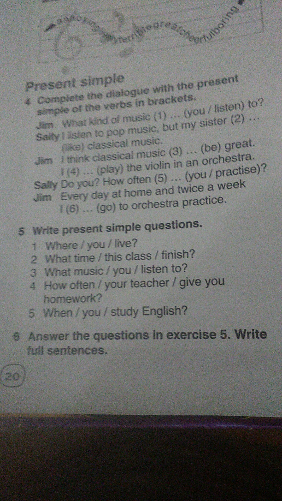 (4) пишу только то, сто нужно изменить. 1. Do you listen. 2. Likes. 3. Is. 4. Play. 5. Do you practice? 6. Go. (5 и 6) 1. Where do you live? – I live in *вставь свой город* 2. What time does this class finish? – This class finishes at 3 p.m. 3. What music do you listen to? – I listen to *rock (или свое вставь)* music 4. How often does your teacher give you homework? – My teacher gives me homework at the end of every lesson. Или можешь сказать my teacher gives me homework *once/twice/three times etc в зависимости как часто дают домашку* a week. 5. When do you study English? – I study English on *вставь дни когда английский*.
