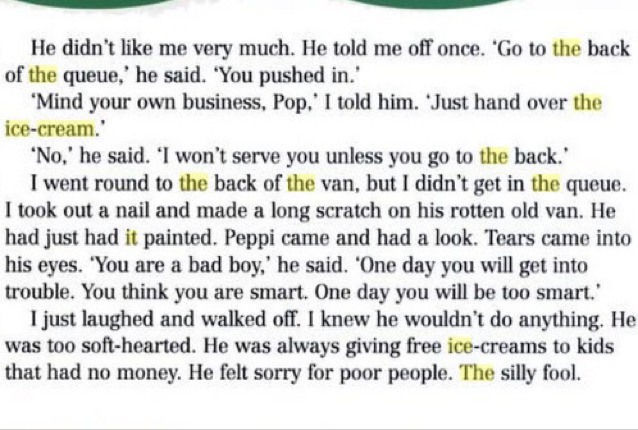 Он не любил меня. Он сказал мне покинуть один раз. "Идите в конец очереди," сказал он. "Вы нажат" Занимайтесь своим делом, Поп, сказал я ему. "Просто сдать мороженое." Нет ", сказал он." Я не буду служить вам, если вы идете к спине ". Я обошел к задней части фургона, но я не получил в очереди. Я вынул гвоздь и сделал длинную царапину на его гнилой старый фургон. Он только что он нарисовал. Пеппи пришел и посмотрел. Слезы пустились у него на глазах. "Ты плохой мальчик," сказал он. "В один прекрасный день вы получите неприятности. Вы думаете, что вы умный. В один прекрасный день вы будете слишком умным". Я просто рассмеялся и ушел. Я знал, что Ne бы ничего не делать. Он был слишком мягким сердцем. Он всегда давал бесплатные мороженое для детей, у которых нет денег. Ему было жаль бедных людей. Глупая дура.
