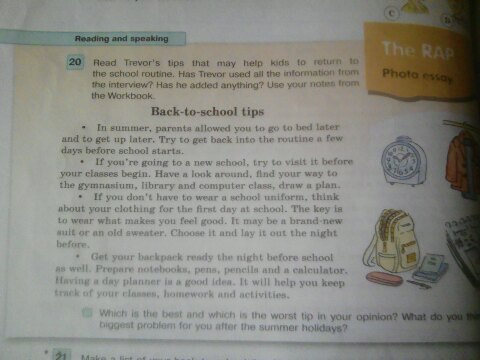 Старательно собери рюкзак до ночи. Приготовь тетради, ручки, карандаши, калькулятор. Завести ежедневник будет неплохой идеей. Он будет тебе помогать хранить расписание уроков, домашнее задание и твою деятельность.