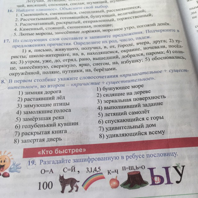 2 столбик- растаявший лед,зимующие птицы,замолкшие голоса,замерзшая река,бушующее море,сидящие на дереве,выполнивший задание,летящий самолет,спускающийся с гор,удивляющийся всему