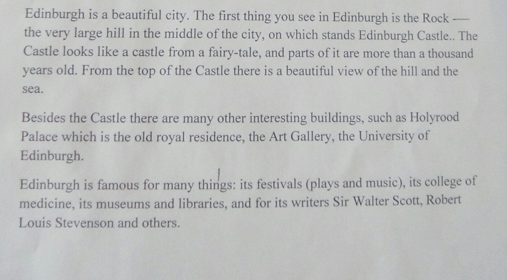 Эдинбург - прекрасный город. Первая вещь, которую ты видишь в Эдинбурге - это гора - очень большой холм в центре города, на котором стоит эдинбургский замок. Замок выглядит как замок из сказки, и некоторым частям замка более 1000 лет. С вершины замка открывается прекрасный вид на холм и море.
