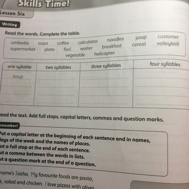 в первую слова с одним слогом,во вторую с двумя слогами и так далее...