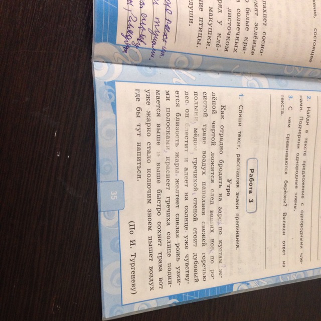 Как отрадно бродить на заре по кустам! Зелёной чертой ложится след ваших ног по росистой траве. Воздух наполнен свежей горечью полыни, мёдом, гречихой. Стеной стоит дубовый лес. Он блестит и алеет на солнце. Уже чувствуется близость жары. Желтеет спелая рожь. Узкими полосками краснеет гречиха. Солнце поднимается выше и выше. Быстро сохнет трава. Вот уже жарко стало. Колючим зноем пышет воздух. Где бы тут напиться?