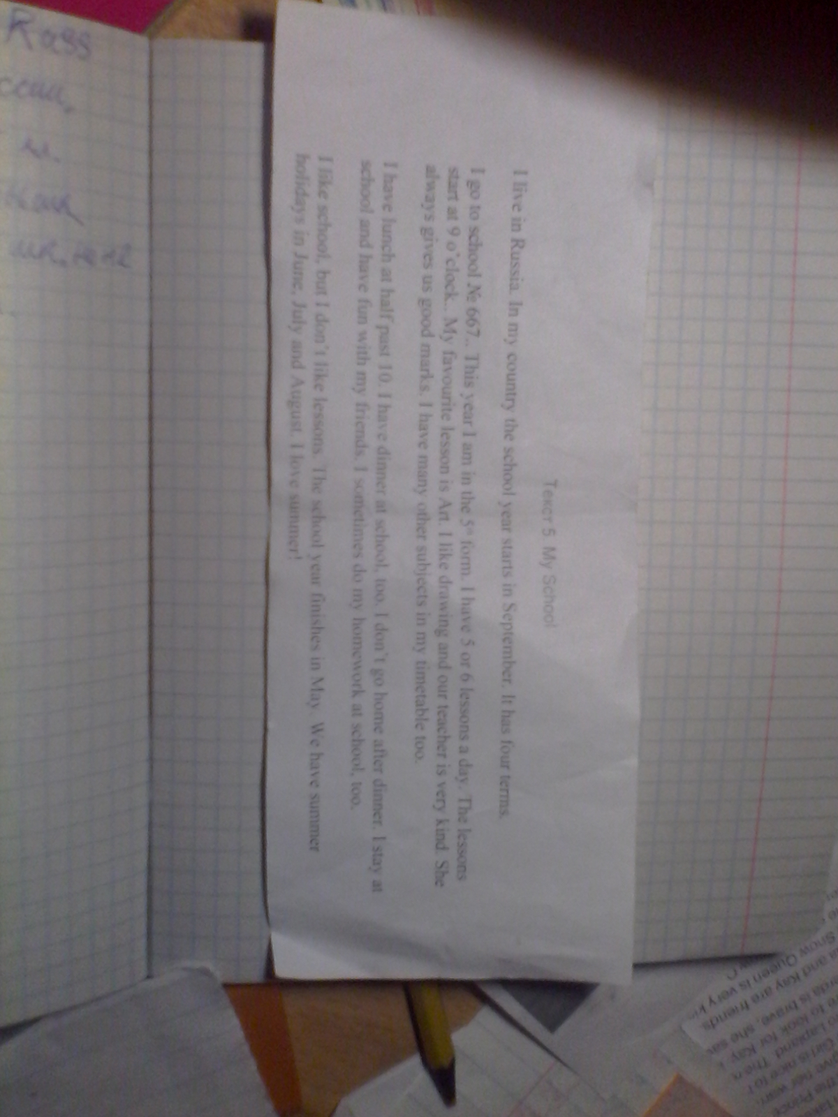 Мне нравится школа, но я не люблю уроки. Учебный год кончается в мае. У нас летние каникулы в июне, июле и августе. Я люблю лето!