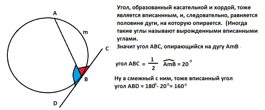 хорда ab стягивает дугу окружности в 40 градусов. Найдите угол ABC между хордой и касательной к окружности, проведенной через точку B. Ответ дайте в градусах