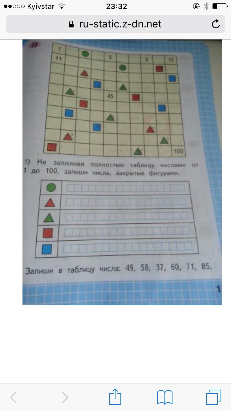 Часть 1)) Не заполняя полностью таблицу числами от 1 до 100, запиши числа закрытые фигурами. Таблица на фото.