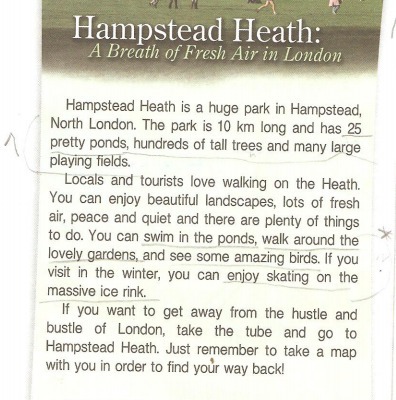Хэмпстед-Хит огромный парк в Хэмпстеде, на севере Лондона. Парк длиной 10 км и имеет 25 красивых прудов, сотни высоких деревьев и многих крупных игровых полей. Местные жители и туристы любят ходить на пустоши. Вы можете наслаждаться красивыми пейзажами, много свежего воздуха, тишины и покоя, и есть много вещей, чтобы отдыхать. Вы можете плавать в прудах, ходить вокруг прекрасных садов, и увидеть некоторые удивительные птицы. Если вы ходите в зимний период, вы можете наслаждаться катанием на катке. если вы хотите, уйти от шума и суеты Лондона, возьмите трубку и пойти в Хэмпстед-Хит. Только не забудьте взять карту с собой для того, чтобы найти свой путь обратно!