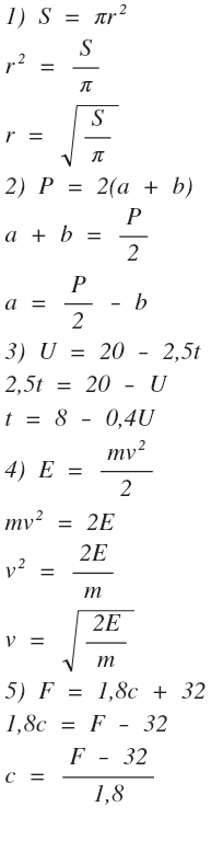1) S=Пr^2 ,выразите радиус r 2)Из формулы периметра прямоугольника ,P=2(a+b)-выразите одну из его сторон 3)Выразите из формулы скорости ,U=20-2,5t -времяt 4)Из формулы кинетической энергии ,E=mU^2/2,выразите скорость U 5)выразите из формулы F=1,8c+32 переменную С